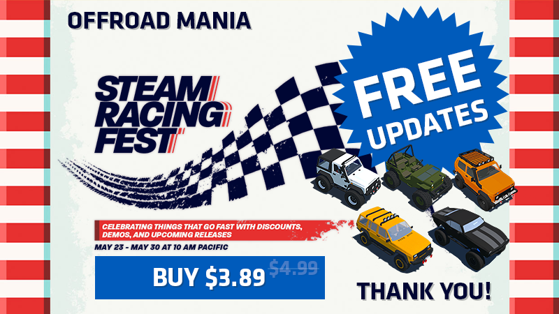 You may have heard that "STEAM RACING FEST 2022" will start from May 23 and you can buy Offroad Mania with a special discount 22% for only $3.89 (*or less for some regions) until May 30!