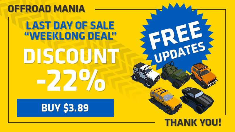 Today (Apr 25, 2022) — is the last day of sale "Weeklong deal" and your last chance to buy Offroad Mania with special price with Discount 22% for only $3.89! (*or less for some regions)