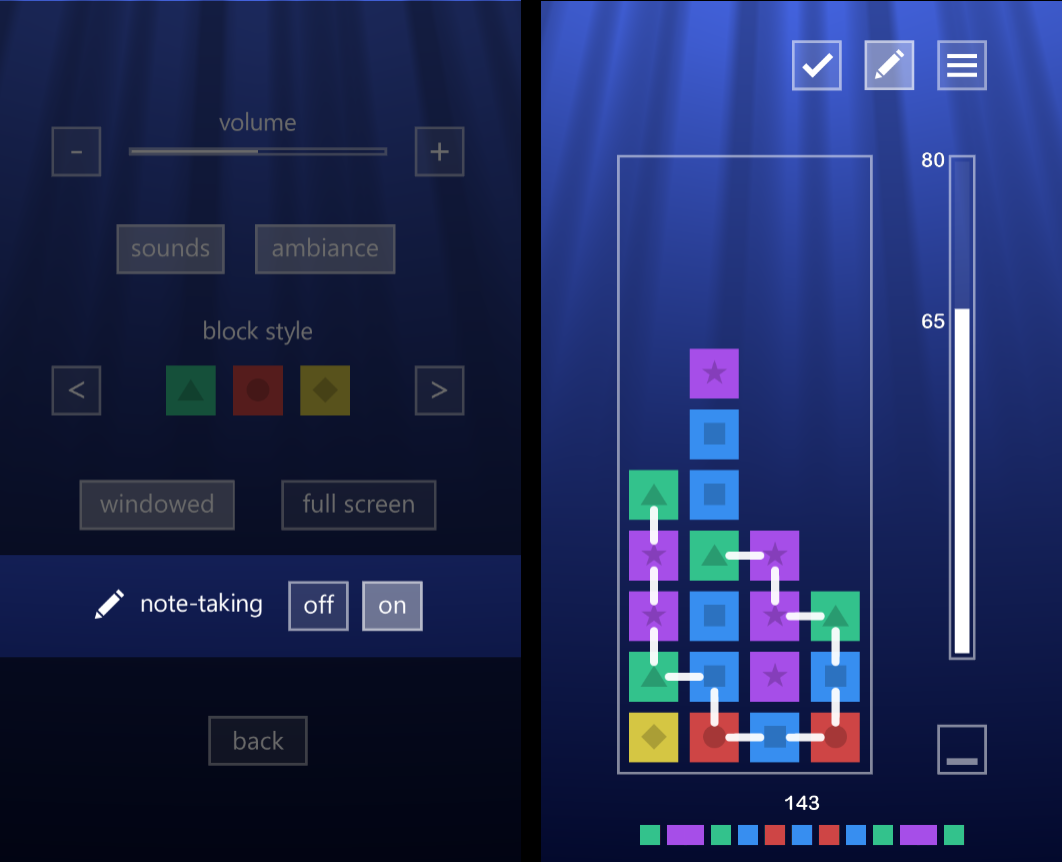 Note-taking mode is handy for planning out long palindromes without having to hold the whole thing in your head. You don't even need to trace them manually; if your notes form a valid palindrome, you can pop it with a single click!
