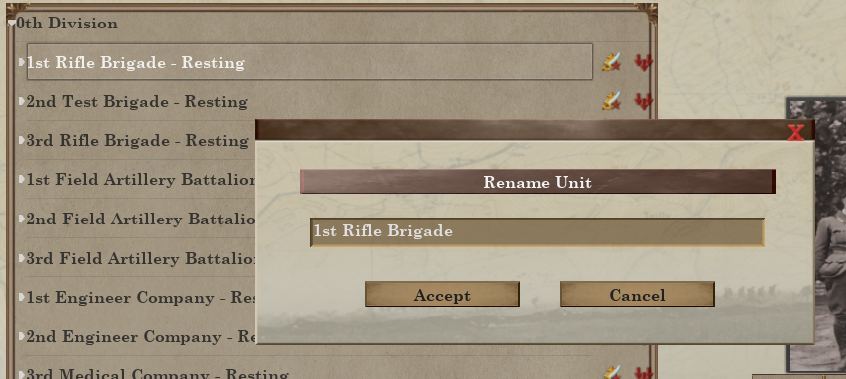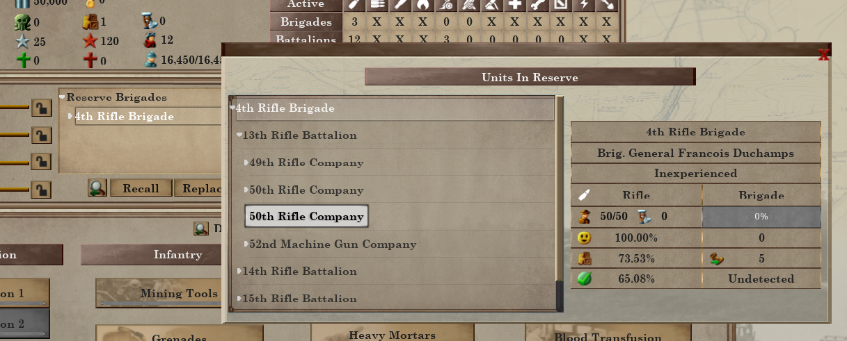 Watch Duty, Rest, and Training are now click-and-drag AOE orders. Watch Duty and Rest will target trench tiles within the selected area, while Training will target open ground tiles. This allows you to select an entire group of units and have them garrison an entire stretch of trenches, or have them spread out and train over a patch of open ground instead of all being stacked on the same tile. This, along with the updated unit window, should make it easier to manage your units by allowing you to issue idle/rest orders over a small area instead of having to manually place subordinate units.