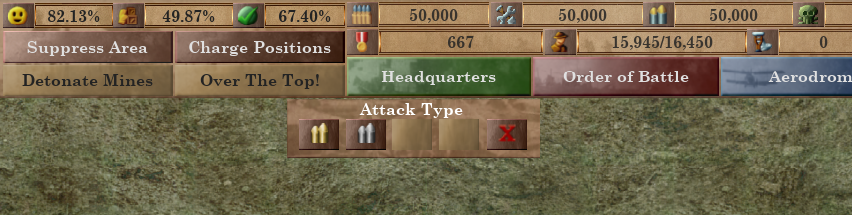 Redesigned the "Suppress Area" command at the top of the screen. Previously, clicking it brought up a second menu which could be used to select artillery shell types. Now there is a small window with separate buttons, similar to Build Mode.