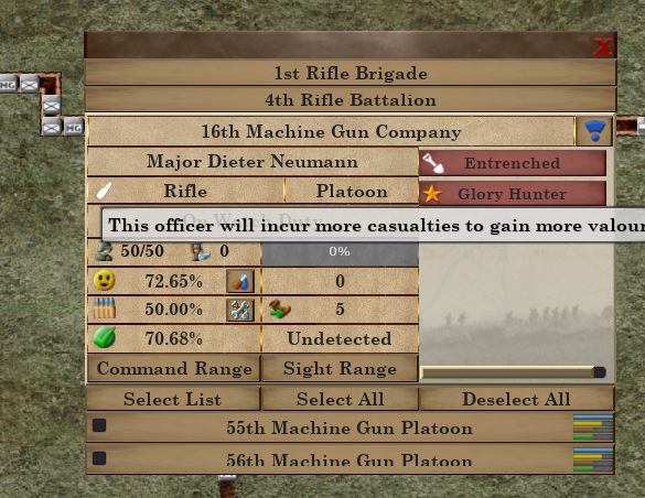 Commanders now possess traits that they pass down to their subordinates. The effect is inversely magnified depending on the commander's rank. That is, the bonuses (and penalties) given by company commander traits is greater than those given by battalion or brigade commanders, with the obvious tradeoff of affecting fewer units. NCOs earned by veteran-level platoons offer the greatest effects from traits.