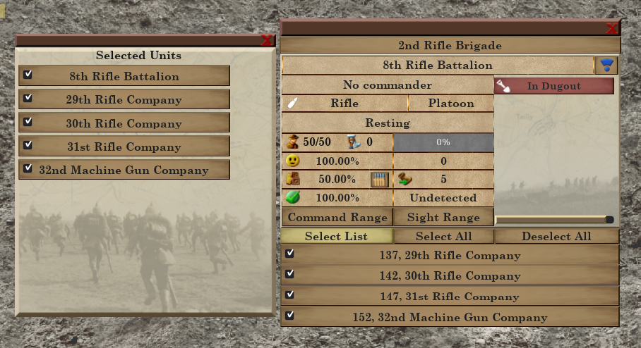 Better UI for managing subordinates/superiors. Right now it takes several clicks to, say, select a company within a brigade, and then to select all platoons in that company. I'm probably just going to steal the interface from HOI3, but it will take me a few days to implement, and I wanted to get an update out today.