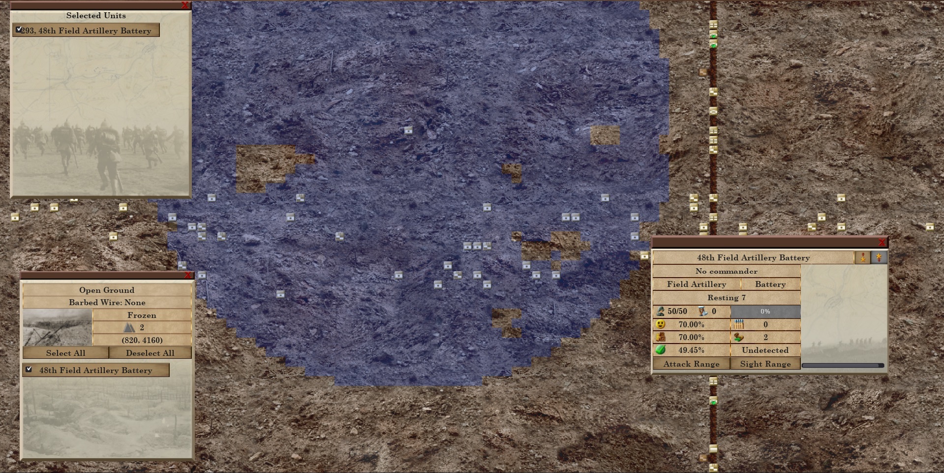 I've got line of sight working for artillery now. Notice that there are small chunks within its range where the selected battery is unable to see/attack. This is because, unlike ballistic weapons like machine guns or rifles, artillery fires upward at a trajectory, so small bumps in the ground only temporarily block the vision of artillery units.
