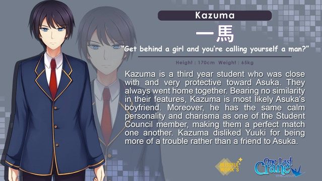 Kazuma is a third-year student who was close with and very protective toward Asuka. They always went home together. As Kazuma and Asuka bear no similarity in their features, Kazuma is most likely Asuka’s boyfriend. Moreover, he has the same calm personality and charisma as one of the student council members, making them a perfect match for one another. Kazuma disliked Yuuki for being more of a troublemaker rather than a friend to Asuka.