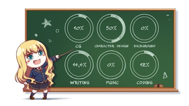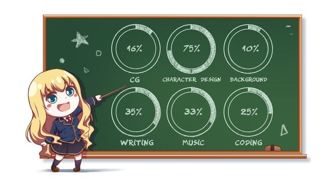 Let's begin with the writing division. The overall progress is going very well, almost reaching 25% of total completion, though we’re still in the common route (a part of the story before you focus on a certain character). At this stage, we'll finally be able to start producing the music by the end of this week. We’re so excited about it!