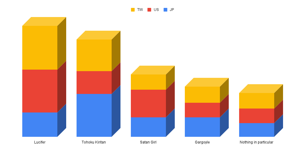 ※Some characters have been excluded. 1st:Lucifer 2nd:Tohoku Kiritan 3rd:Satan 4th:Gargoyle 5th:None in particular