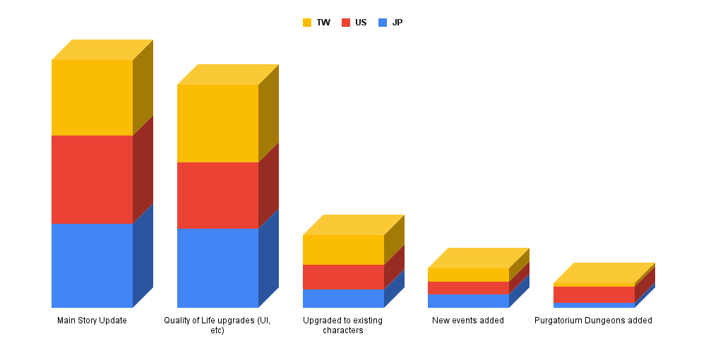 1st:Main Story Update 2nd:Quality of Life upgrades (UI, etc) 3rd:Upgraded to existing characters 4th:New events added 5th:Purgatorium Dungeons added