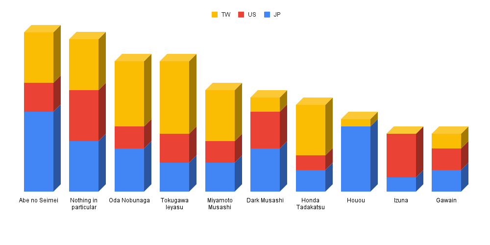 ※Some characters have been excluded. ※We apologize for any discrepancy in answers as a result of slight incongruencies in the wording of the Traditional Chinese question. 1st:Abe no Seimei 2nd:None in particular 3rd:Oda Nobunaga 4th:Tokugawa Ieyasu 5th:Miyamoto Musashi 6th:Dark Miyamoto Musashi 7th:Honda Tadakatsu 8th:Houou 9th:Izuna 10th:Gawain