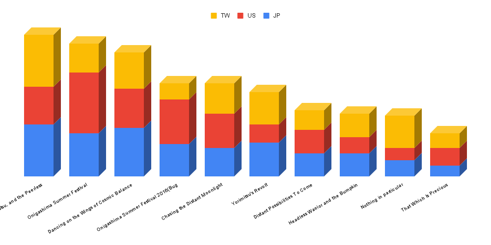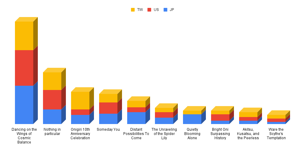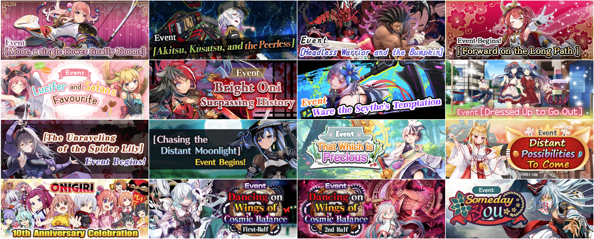 ※Some events have been excluded. 1st:Akitsu, Kusatsu, and the Peerless 2nd:Onigashima Summer Festival Quest 3rd:Dancing on the Wings of Cosmic Balance 4th:Onigashima Summer Festival Quest 2016 (Bug Catching) 5th:Chasing the Distant Moonlight 6th:Yorimitsu's Revolt 7th:Distant Possibilities To Come 8th:Headless Warrior and the Bumpkin 9th:None in particular 10th:That Which Is Precious