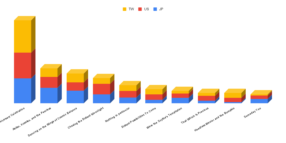 1st:Onigiri 10th Anniversary Celebration 2nd:Akitsu, Kusatsu, and the Peerless 3rd:Dancing on the Wings of Cosmic Balance 4th:Chasing the Distant Moonlight 5th:None in particular 6th:Distant Possibilities To Come 7th:Ware the Scythe's Temptation 8th:That Which Is Precious 9th:Headless Warrior and the Bumpkin 10th:Someday You