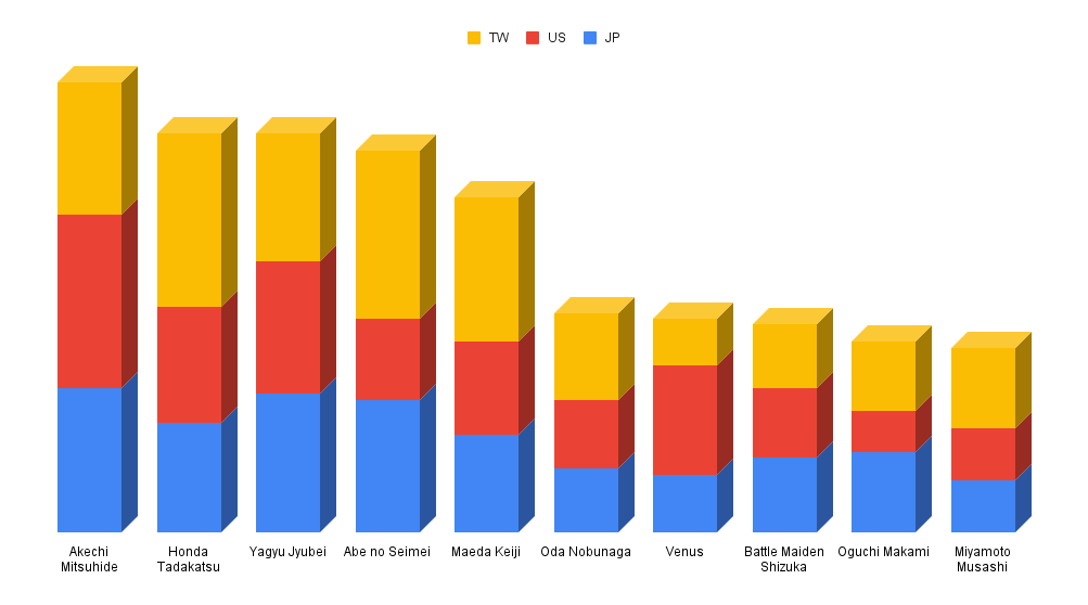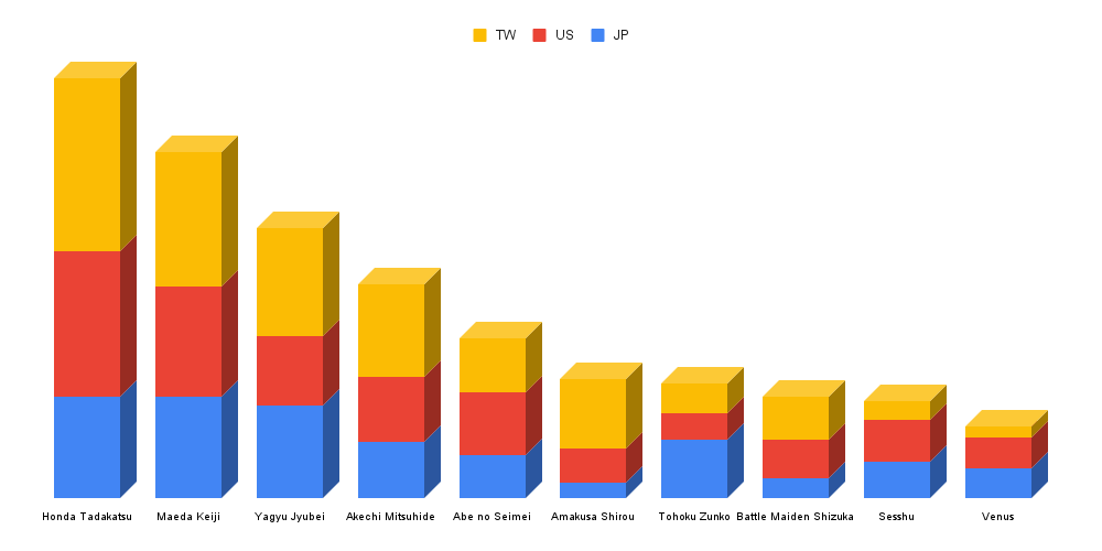 ※Some characters have been excluded. ※We apologize for any discrepancy in answers as a result of slight incongruencies in the wording of the Traditional Chinese question. 1st:Akechi Mitsuhide 2nd:Honda Tadakatsu 3rd:Yagyu Jubei 4th:Abe no Seimei 5th:Maeda Keiji 6th:Oda Nobunaga 7th:Venus 8th:Battle Maiden Shizuka 9th:Ooguchi Makami 10th:Miyamoto Musashi
