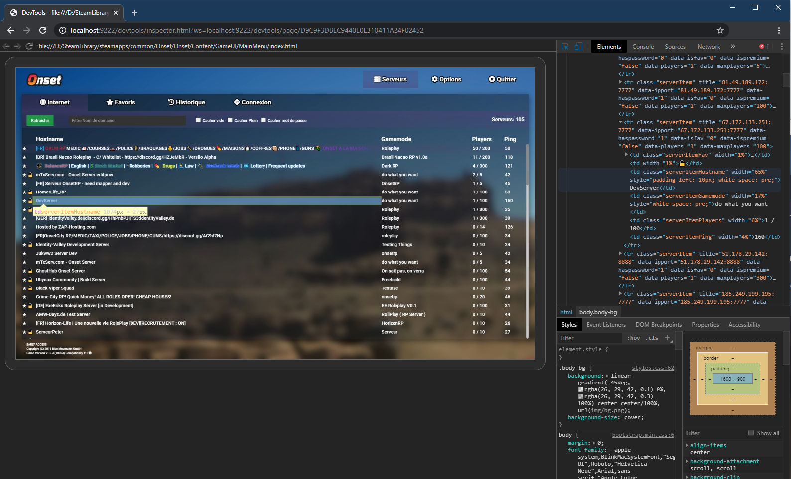 WebUI Remote Debugging (Dev Tools) Inspect your Onset UI in Google Chrome. Start Onset with the -dev flag and connect to localhost:9222 in Chrome. You can specify a different port to Onset like this: -cefdebug=1337 The image below shows the dev mode being used on the main menu.