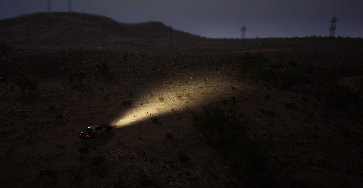 Improved vehicle front lights and helicopter search lights Vehicle lights usually have a large impact on the geometry in front of it. Using a standard light would be too performance heavy. The new system fakes the light in the world no matter how far the light goes.