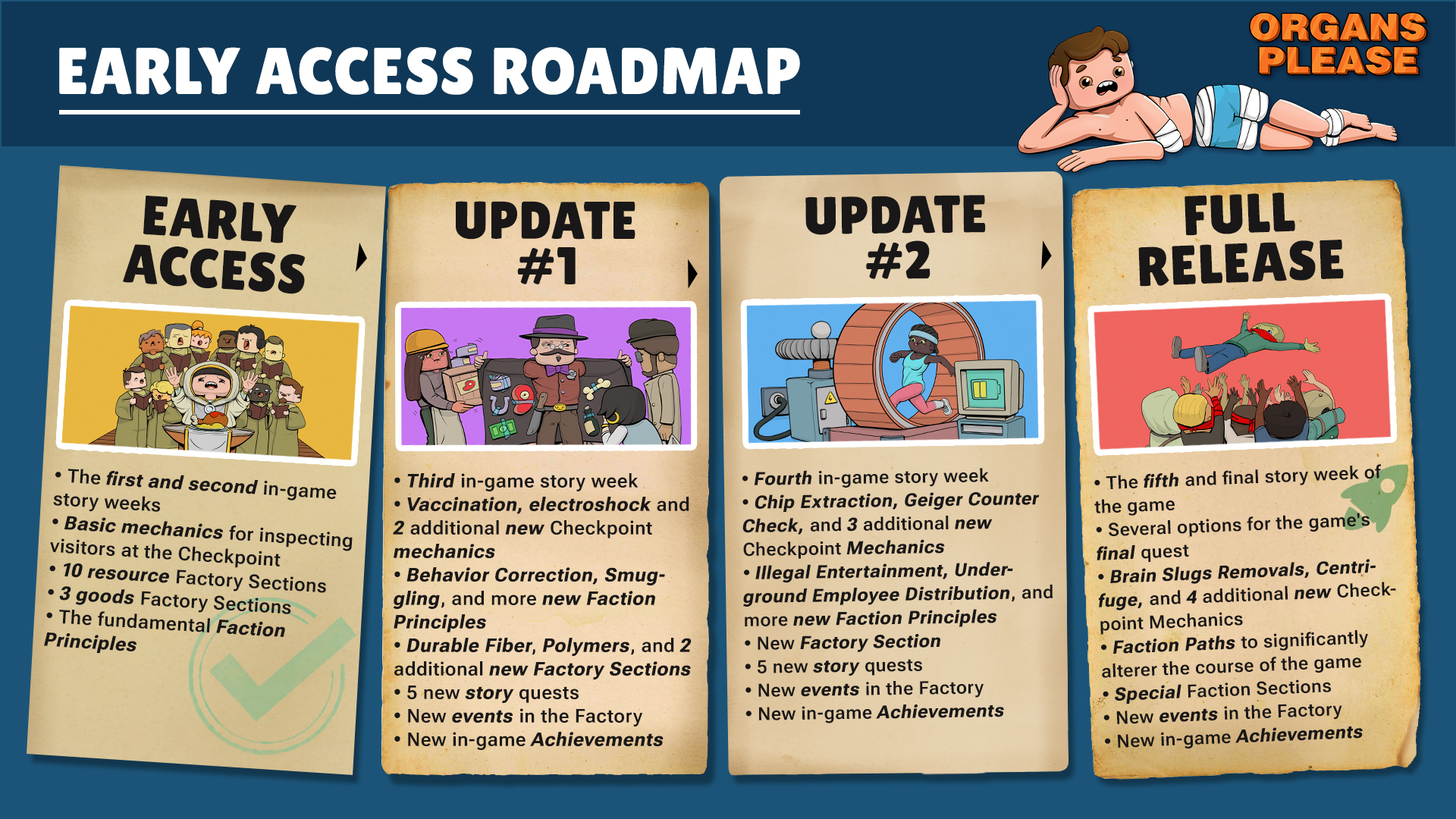 In the Full Release, we will open the fifth and final week of the Organs Please storyline. The fifth story week prepares new challenges for the Factory administrator, and all the hard choices throughout the game will culminate into one of several finales.