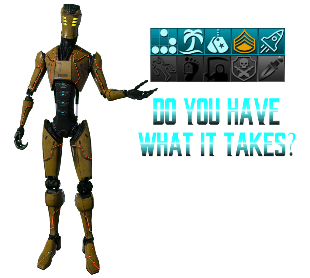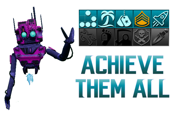 Hacker - Complete the Plaza level Beach Bum - Complete the Transport Station level Little Buddy - Complete Catwalks level Dogs of War - Complete the Hangar level On Our Way! - Run the gauntlet and escape in the X1 Murderer - Kill a civilian Serial Killer - Kill 50 civilians Psycho Killer - 100 civilians killed, you monster! Ooopsie! - Die one time Kevorkian - Die 25 times Wellness Check - Die 50 times. Are you even good at this game? Private - Kill 1 soldier Sarge - Kill 50 soldiers Captain - Kill 100 soldiers Colonel - Kill 250 soldiers General - Kill 500 soldiers Rambo - Kill 1000 soldiers. "To survive a war, you gotta become a war"