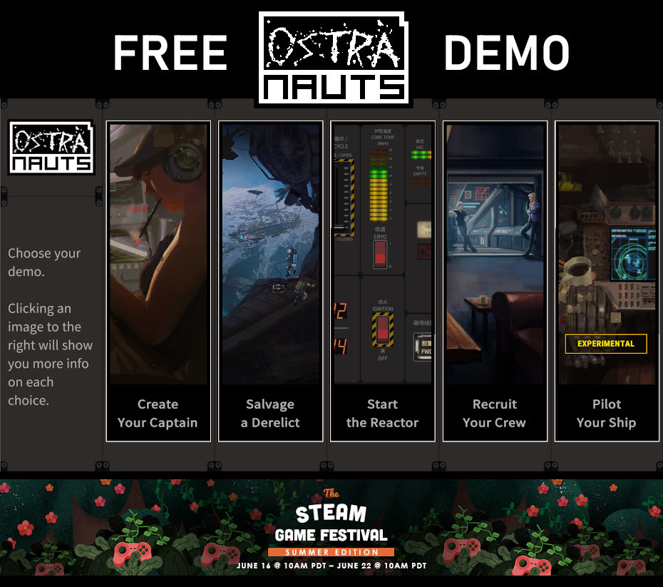 The same demo we showcased at PAX East 2020 will be available for you to try, free, starting June 16th at 10am Pacific Time on Steam. You can get hands-on time with character creation, salvaging, the reactor controls, socializing, and some really early experiments with ship navigation.