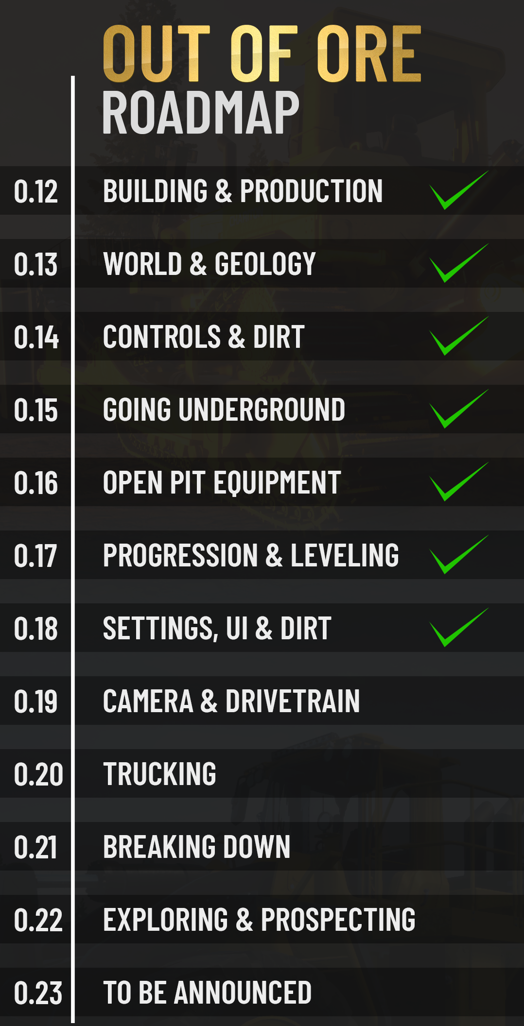 The upcoming update 0.18 "Dirt & General improvments" is on schedule and everything is still going according to plan and we are testing everything at the moment, the update is estimated to drop on 22/23th September