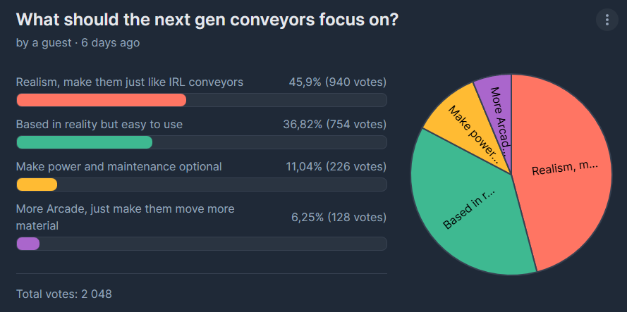 Last week's straw poll showed that most of you wanted the conveyors to be realistic but easy to use, and that's pretty much exactly what we have been building. So, we will just continue down that line.