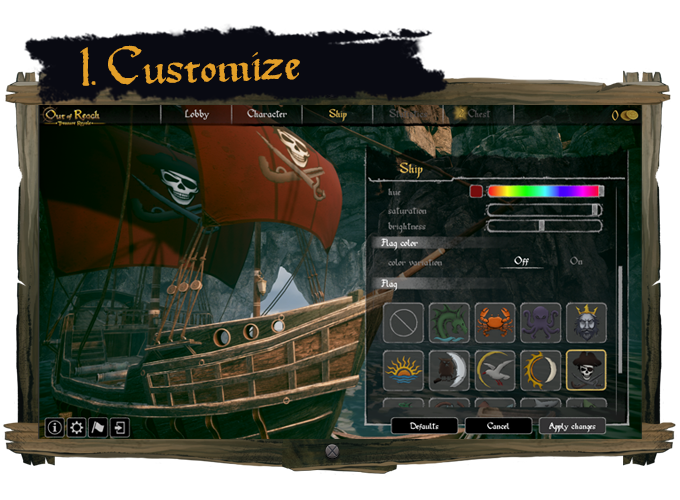 Every crew starts their journey on a pirate ship equipped to destroy other ships and, in the meantime, cross oceans as fast as possible. First things first, the crew captain is given an opportunity to choose a ship skin, sails colors and one of the unlocked banners.