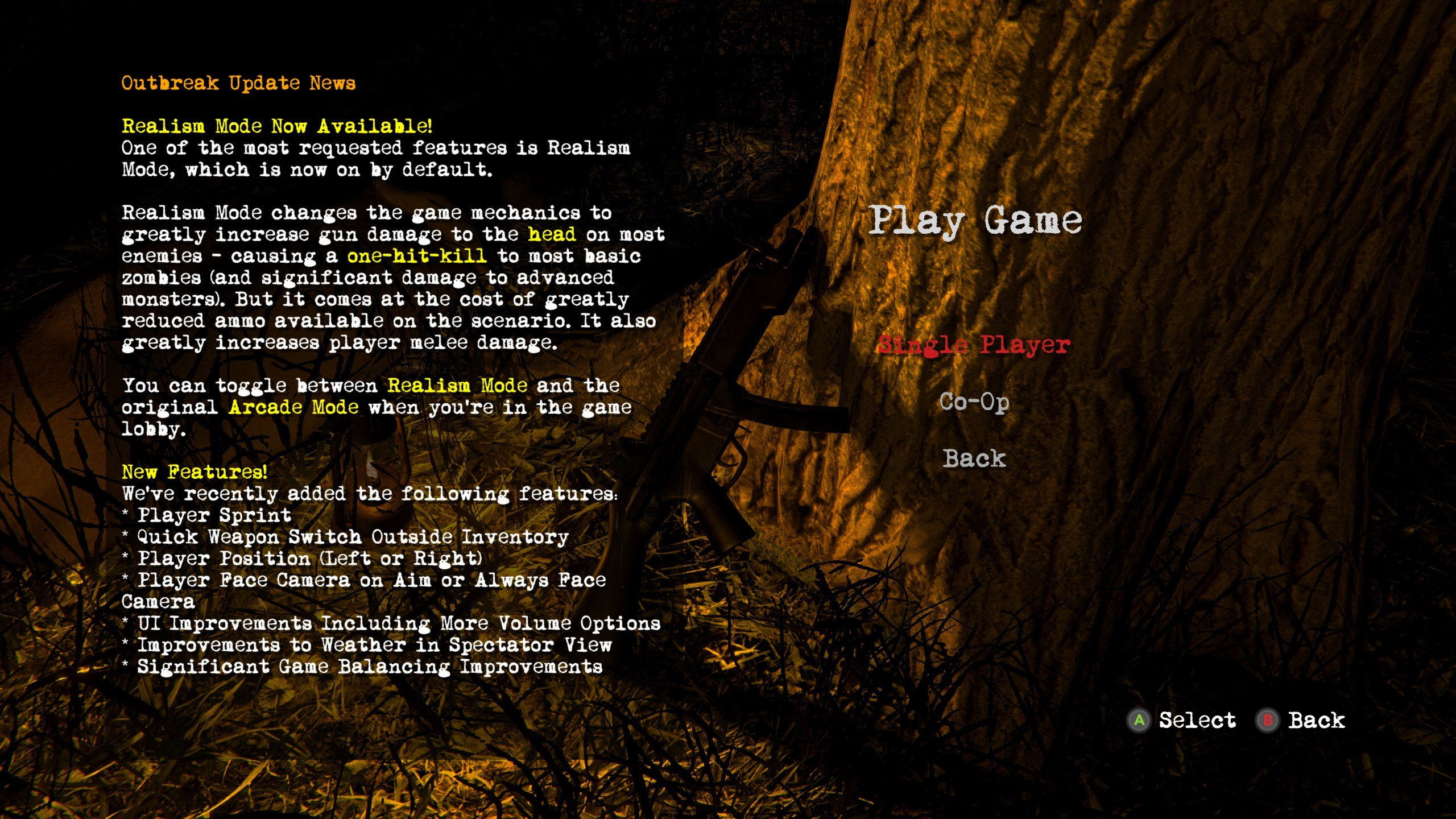 Realism Mode - This brand new way of playing Outbreak: Epidemic notches up the realism by significantly boosting headshot damage - meaning many standard enemies could be killed in a single well placed headshot. But as a trade-off, you now have much less resources to work with. You need to make every bullet count if you want to survive. Advanced monsters can still take a beating, but your only way to defeat them is by going for the head! NOTE: Like the old way Epidemic played? It's still available - just switch back to Arcade Mode in your game lobby!