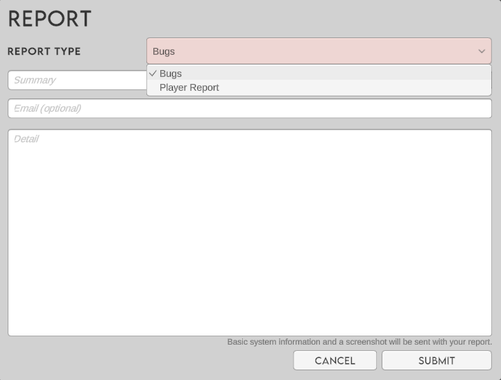 Updated the F9 menu to support reporting players and removed feedback category to remove noise from the reports. Keep sending feedback via Discord and Steam!