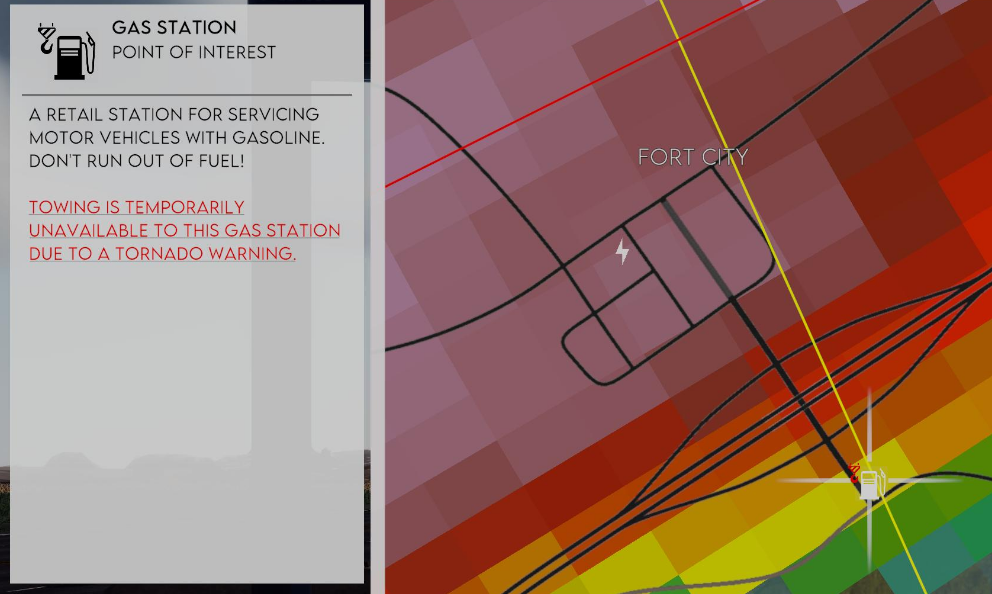 To prevent players being towed directly to their inevitable demise, we’re adding a status on the gas stations to disable towing when inside a tornado warning. This new feature comes with an icon and a description on the map.