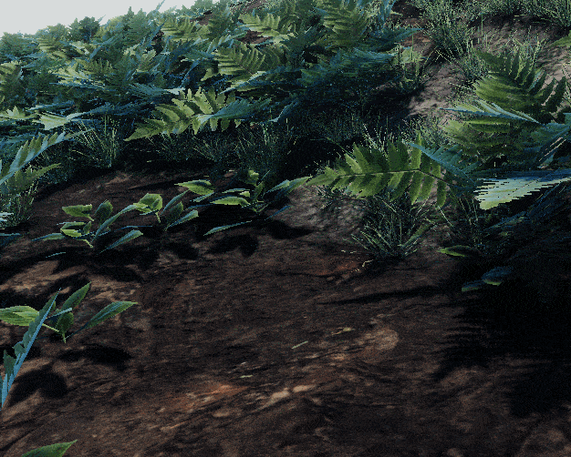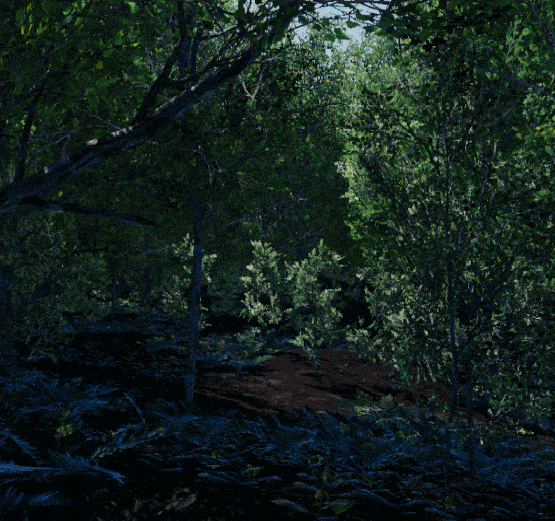 Last month we showed the start of the work on the terrain and vegetation, ending the newsletter on some exploration on the trees. This month we can show how far the vegetation progressed with some animated gifs of the OUTBRK biomes with new trees integrated and rigged for wind: