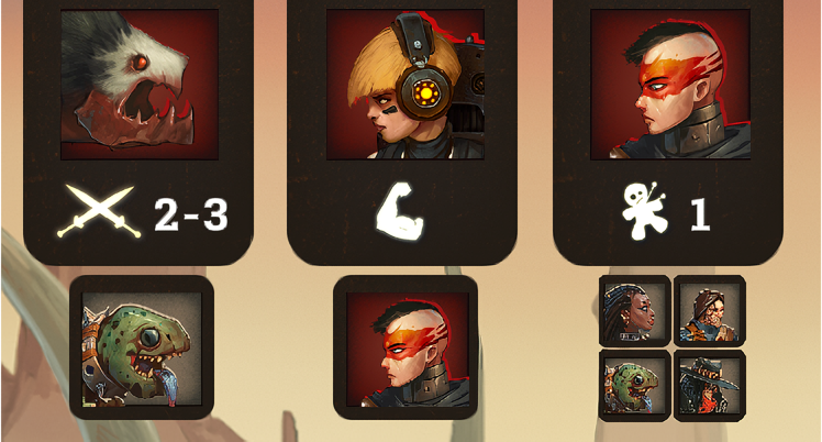 Those icons correspond to the upcoming moves of your opponents. The enemy order, the approximate damage you’re going to receive, and even the attack type. You won’t survive in the Wasteland for long if you can’t use this knowledge to your advantage. You are far from being a clairvoyant, however. Take a gander: