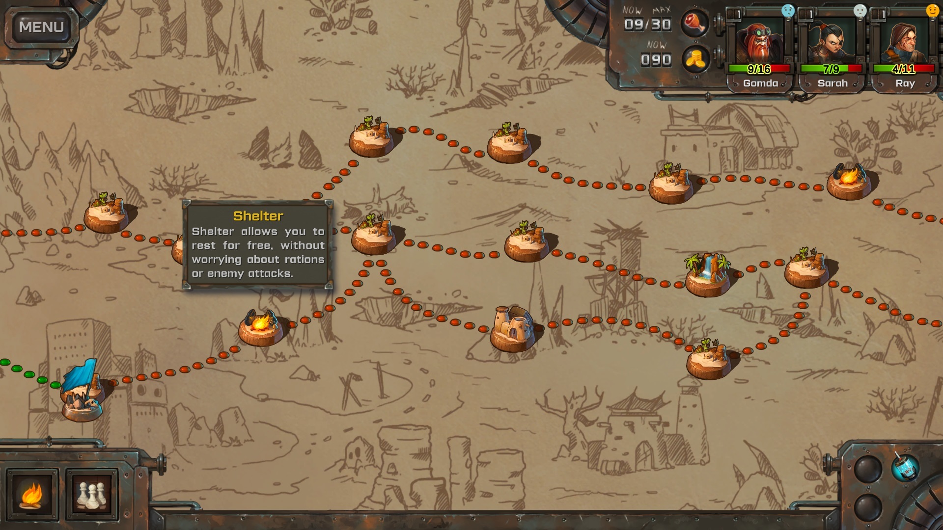 Here you’ll chart a course to the unimaginable riches waiting you at the end of the journey. The team travels from left to right, never turning back. On each step of the way, you’ll decide where to go next.