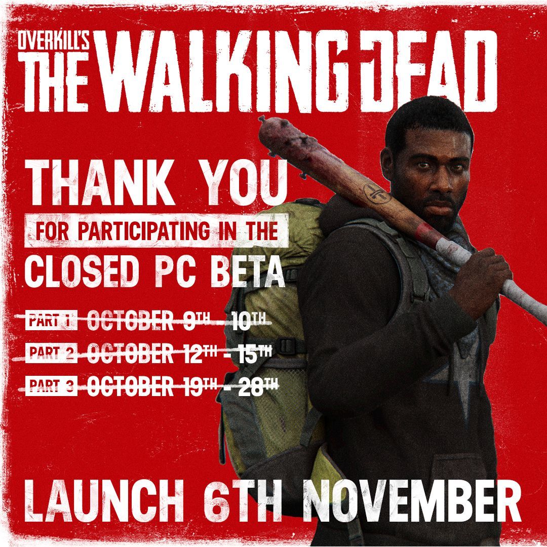 We've had a lot of fun playing with you during the Closed PC BETA, and look forward to seeing you again on the release of OVERKILL’s The Walking Dead on November 6th.