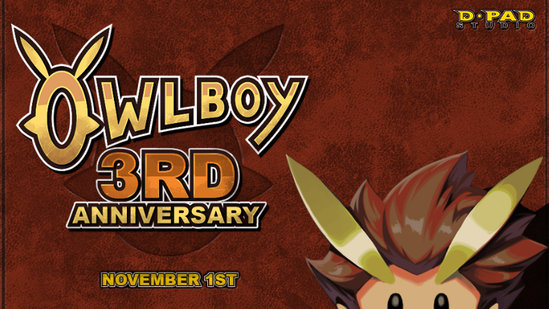 Join us on Nov 1st for Owlboy's 3rd Anniversary! We will be looking back at Otus's long journey throughout the week with some special surprises along the way! Keep your eyes to the sky and see you this Friday! https://twitter.com/DPadStudio