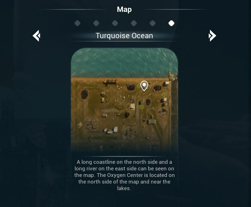 The map has a long coastline on the north side and a long river on the east side. The Oxygen Center is located on the north side of the map and near the lakes.
