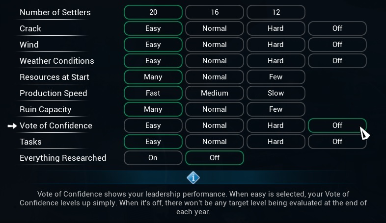 There is an OFF option for the Vote of Confidence. If you don't want to be evaluated at the end of each year, you should select OFF for Vote of Confidence. As you know, in case of failing the annual target level, your settlers may leave you.