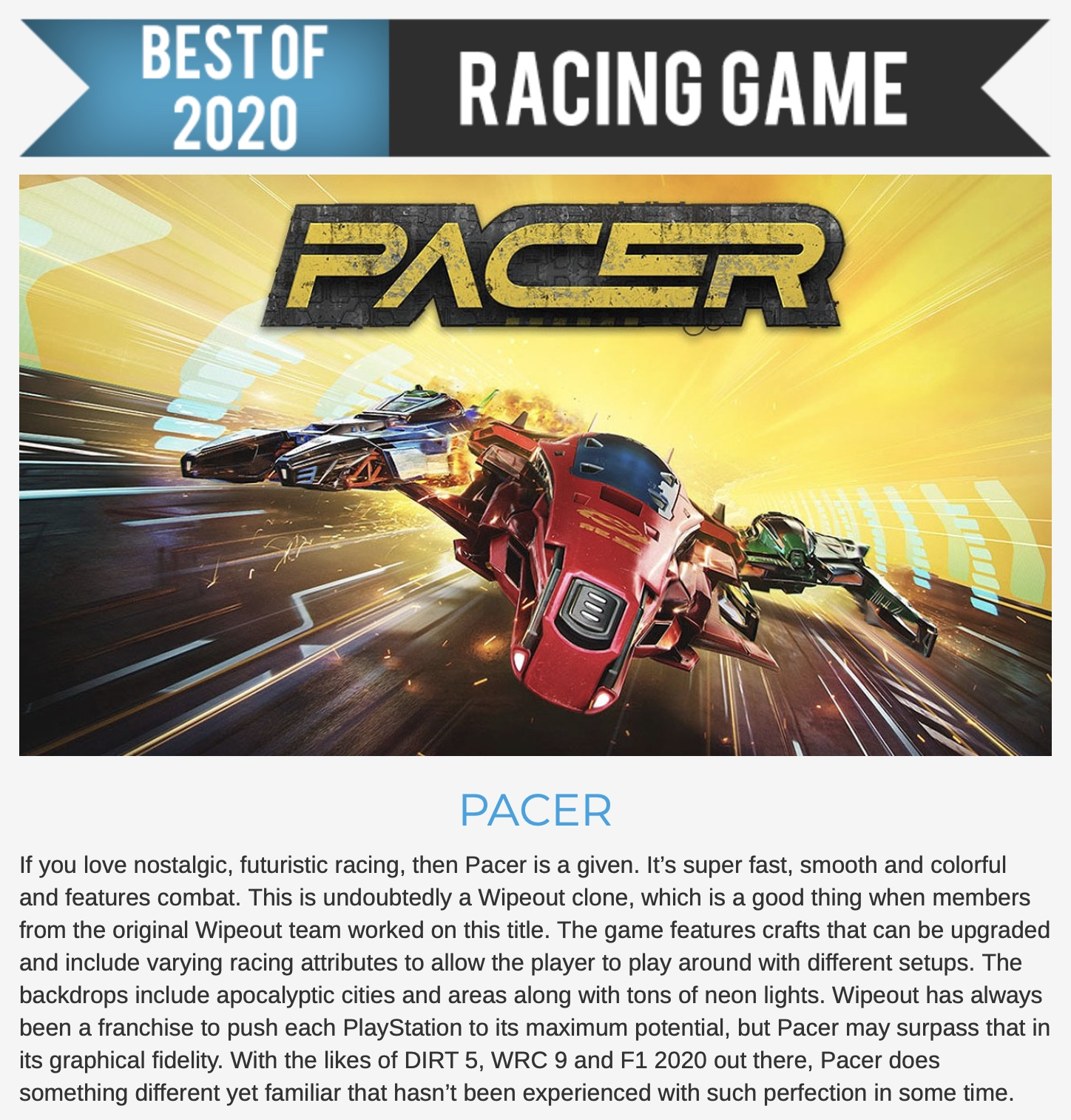 "With the likes of DIRT 5, WRC 9 and F1 2020 out there, Pacer does something different yet familiar that hasn’t been experienced with such perfection in some time"
