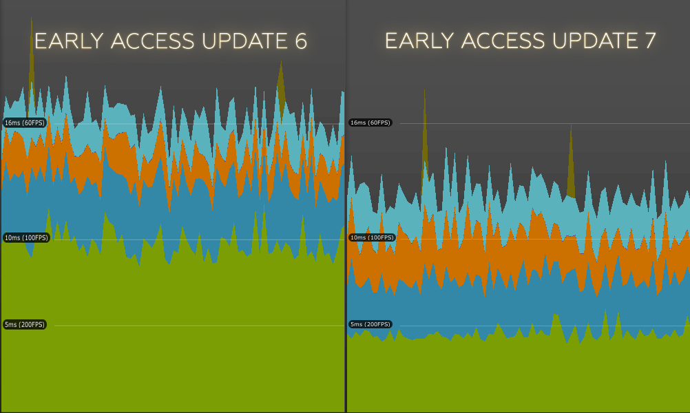 On the picture above, you can see the performances reported by Unity in one of our heaviest level (the Foundry). These show the time taken by rendering (green), scripts (blue), physics computations (orange) and animation (light blue). As you can see, we adjusted the picture to line up the vertical scale, and in the same situation (we positioned the Overseer and Challenger the same way), the new update performed much better on our test machine (running a GTX 1080)!