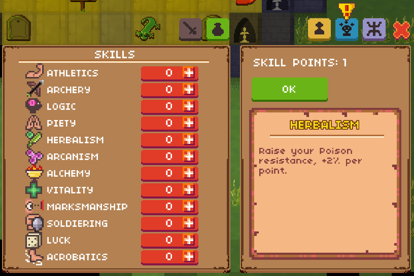 New Skill system, with 1 points per level to distribute. The 12 skills are: Athletics / Archery / Logic / Piety / Herbalism / Arcanism / Alchemy / Vitality / Marksmanship / Soldiering / Luck / Acrobatics.