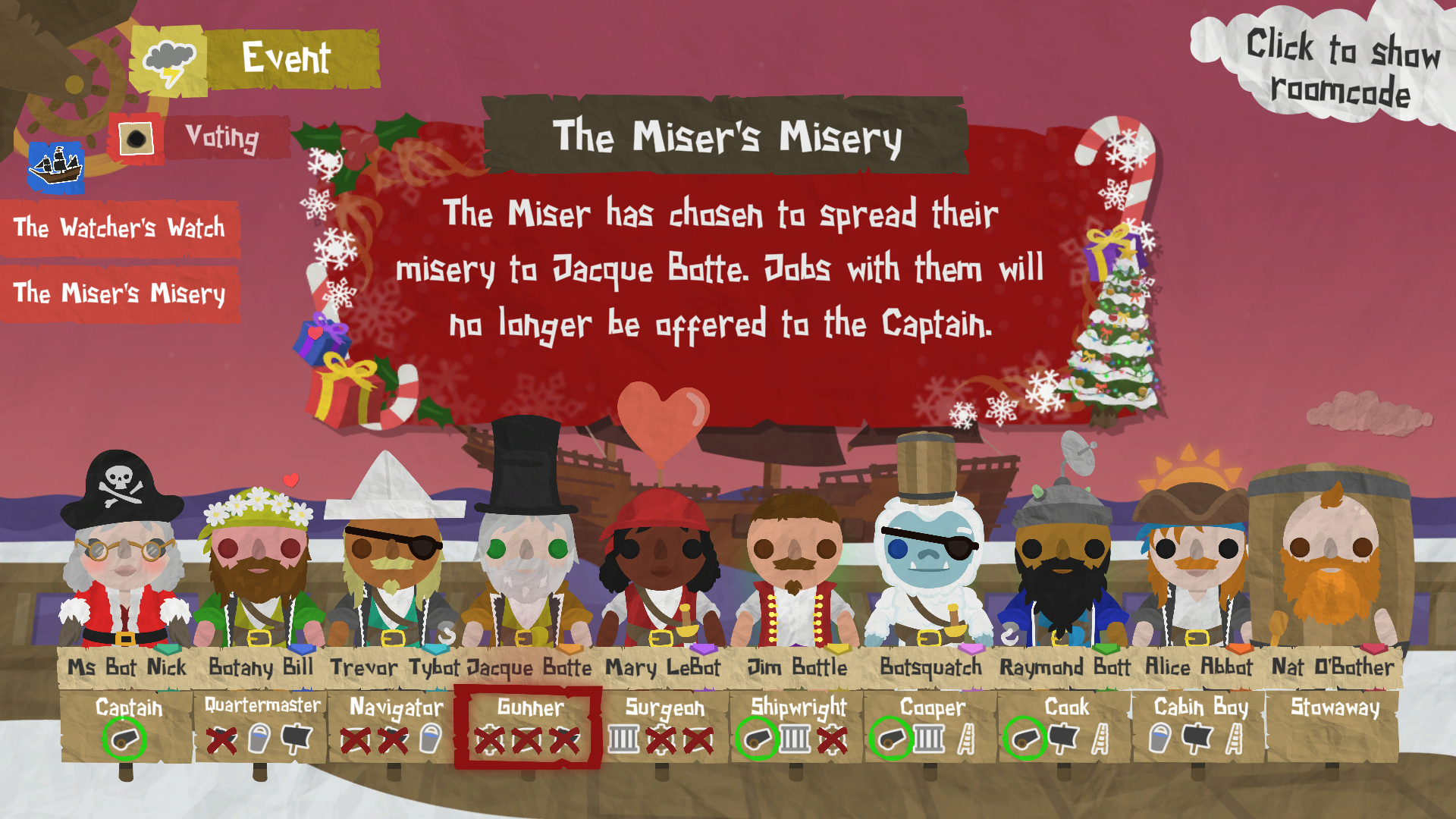 The Miser is a new seasonal trait for 2024, appearing only in Trait+ games. The Miser has the ability to block a pirate from appearing in any jobs. That's right - once The Miser has targeted a pirate, the Captain will never be offered a job with that pirate in.