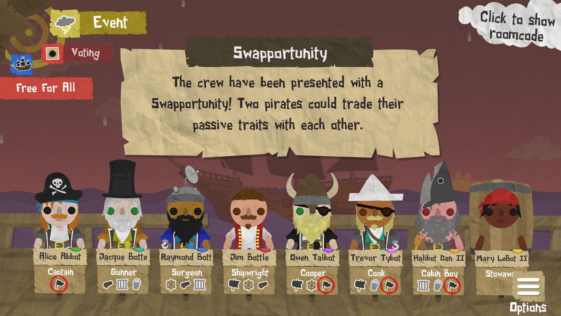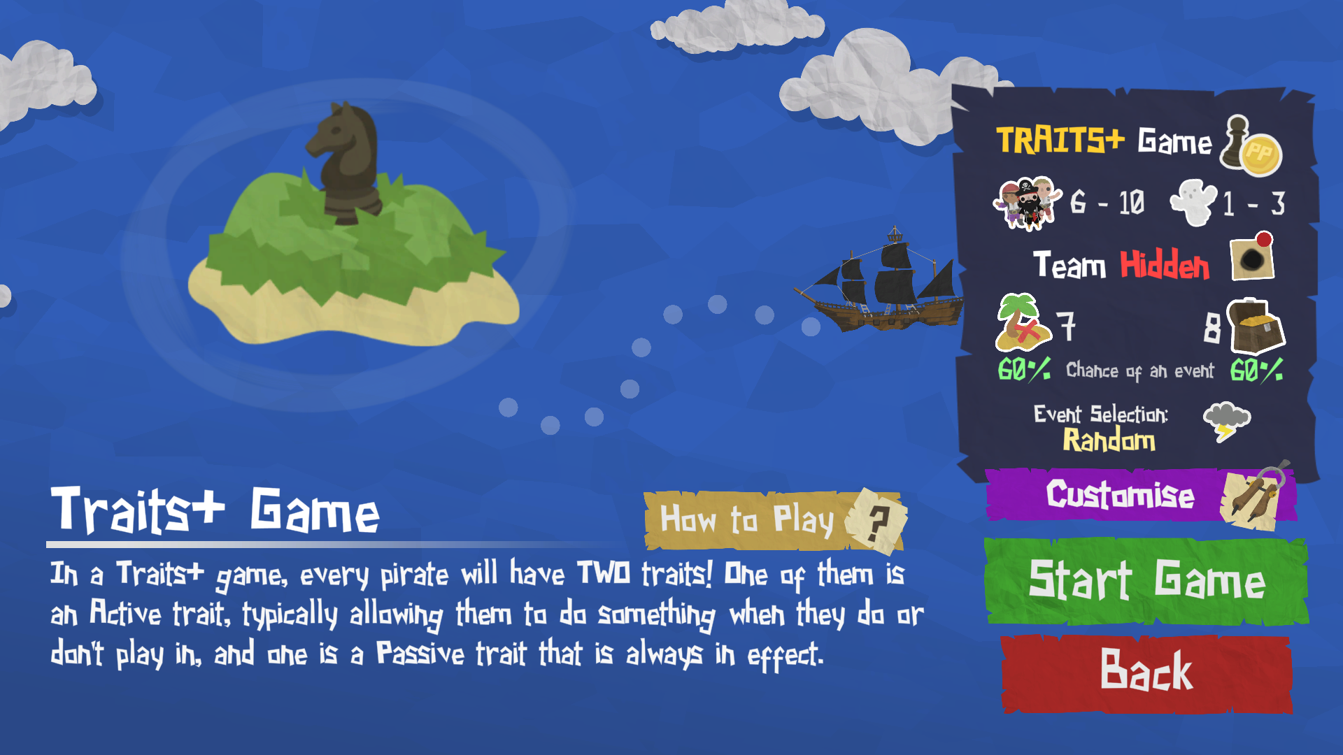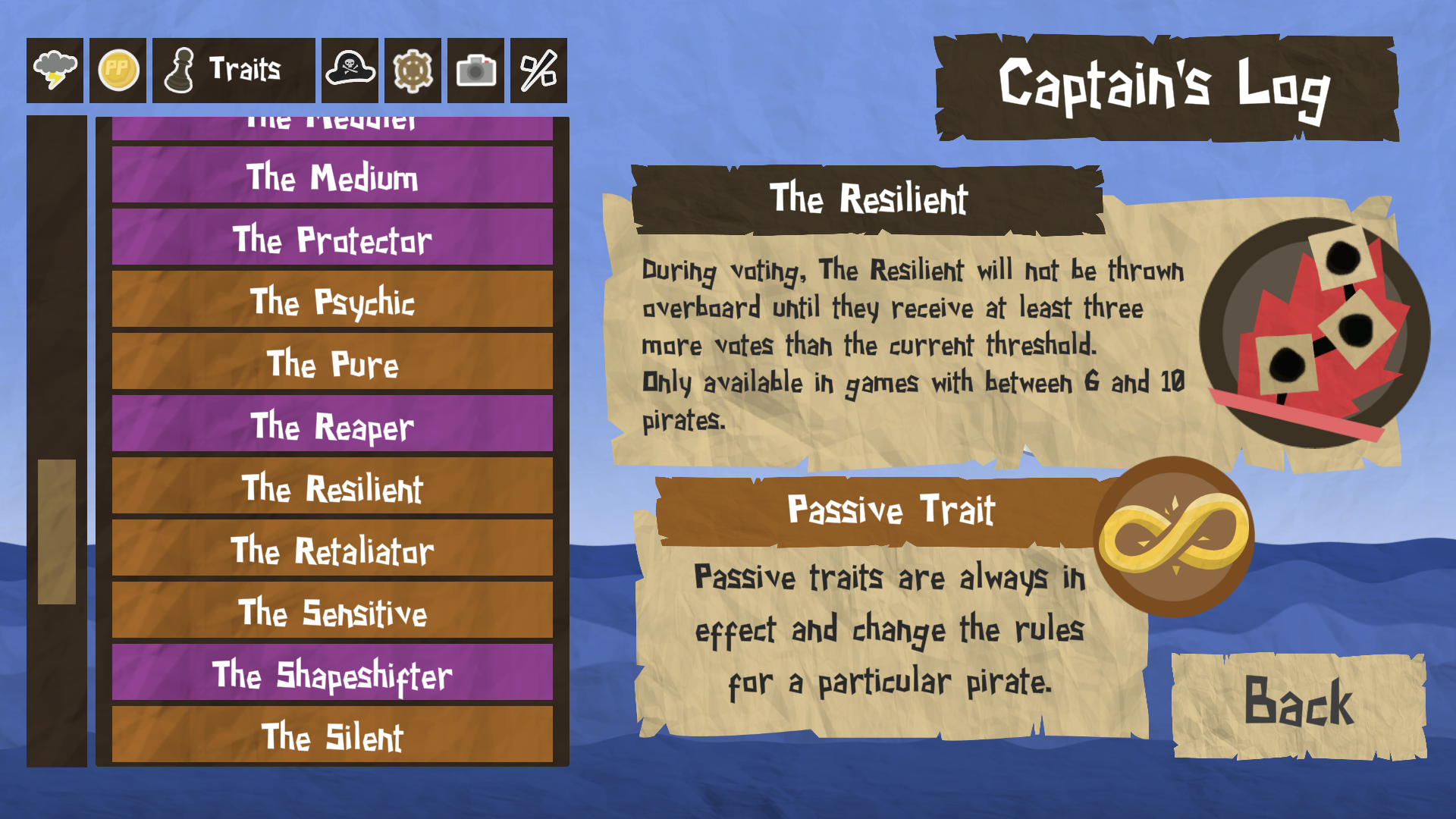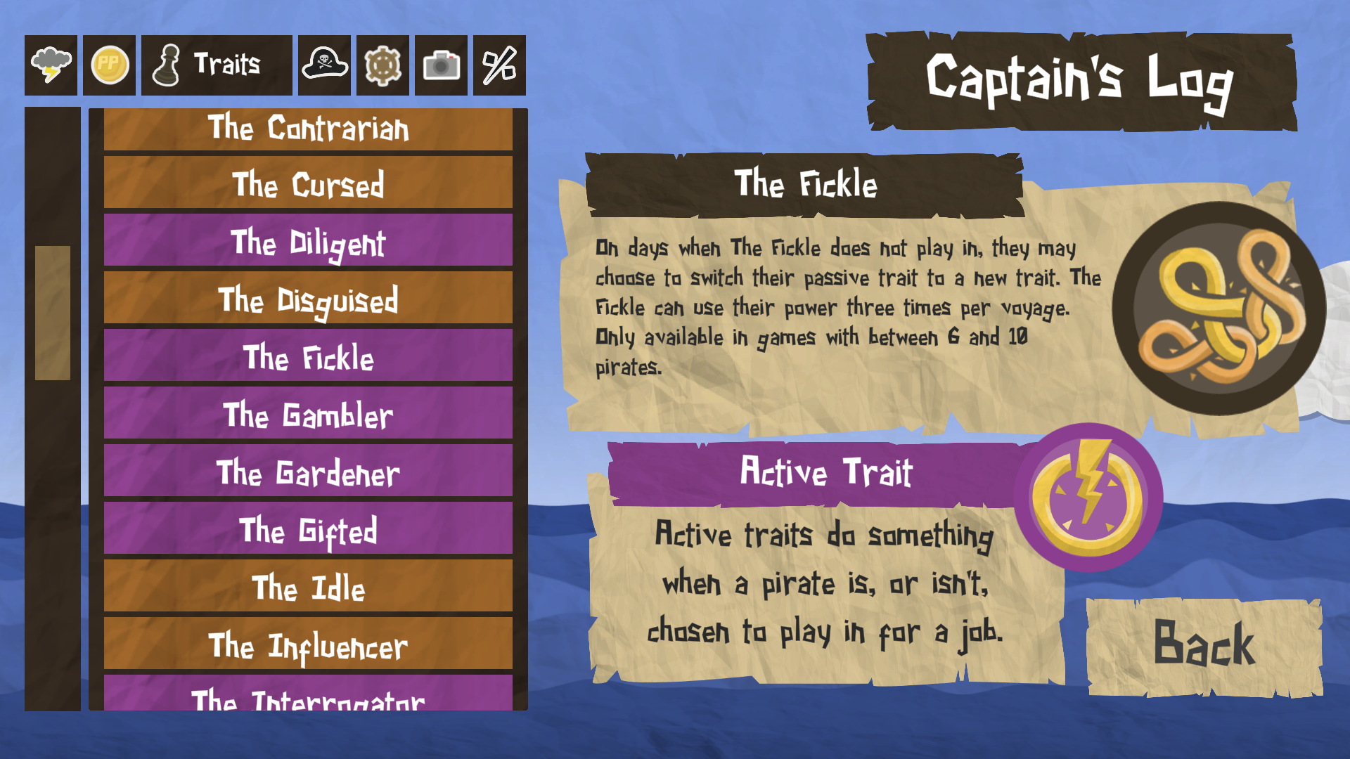 We've updated the Captain's Log and the game customisation screen to clearly list which traits are active and which are passive. If your voyage configuration doesn't have enough active or passive traits to go round the whole crew, some of the pirates might be declared Innocent (in place of a passive trait), or Inactive (in place of an active trait).