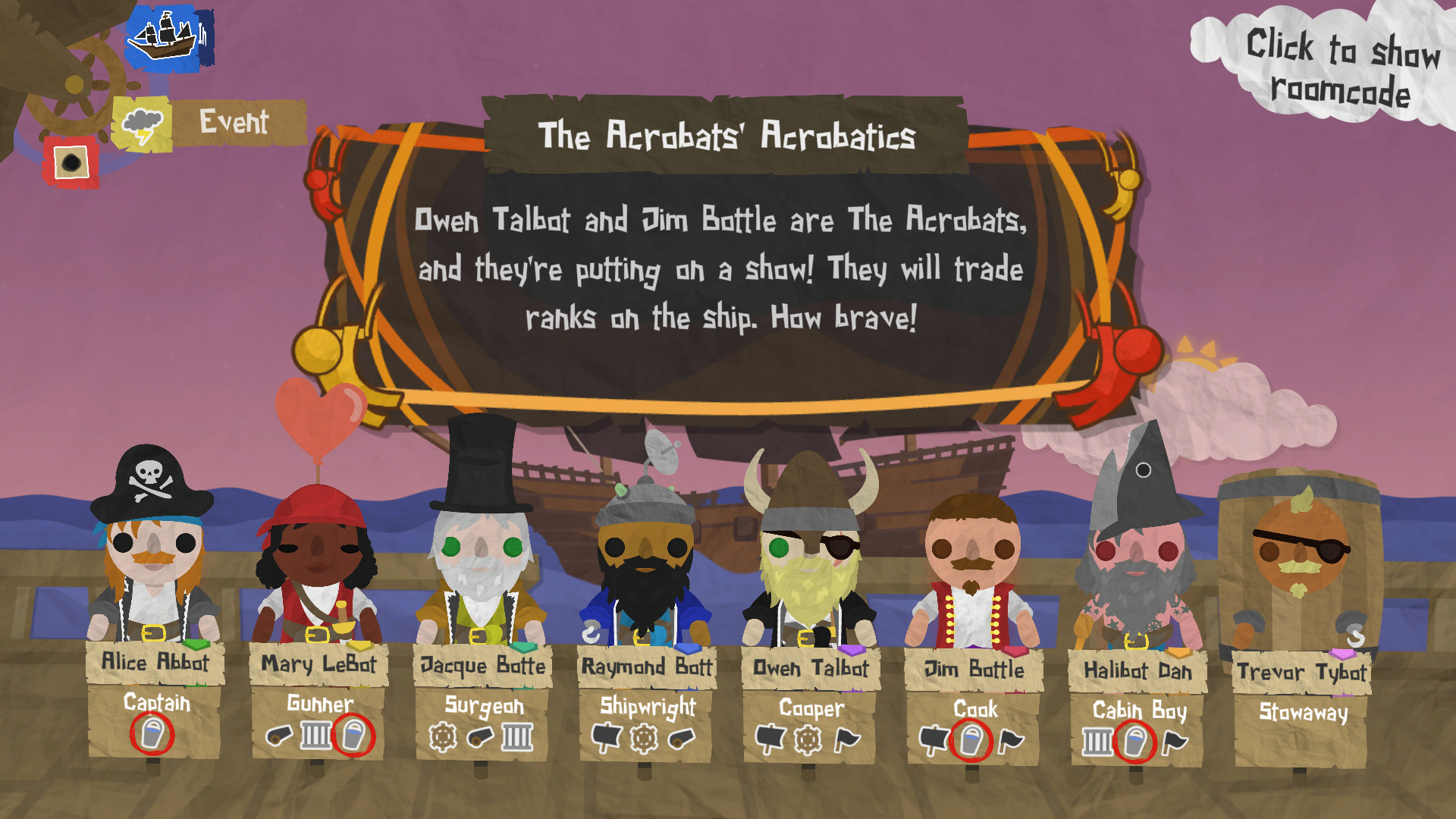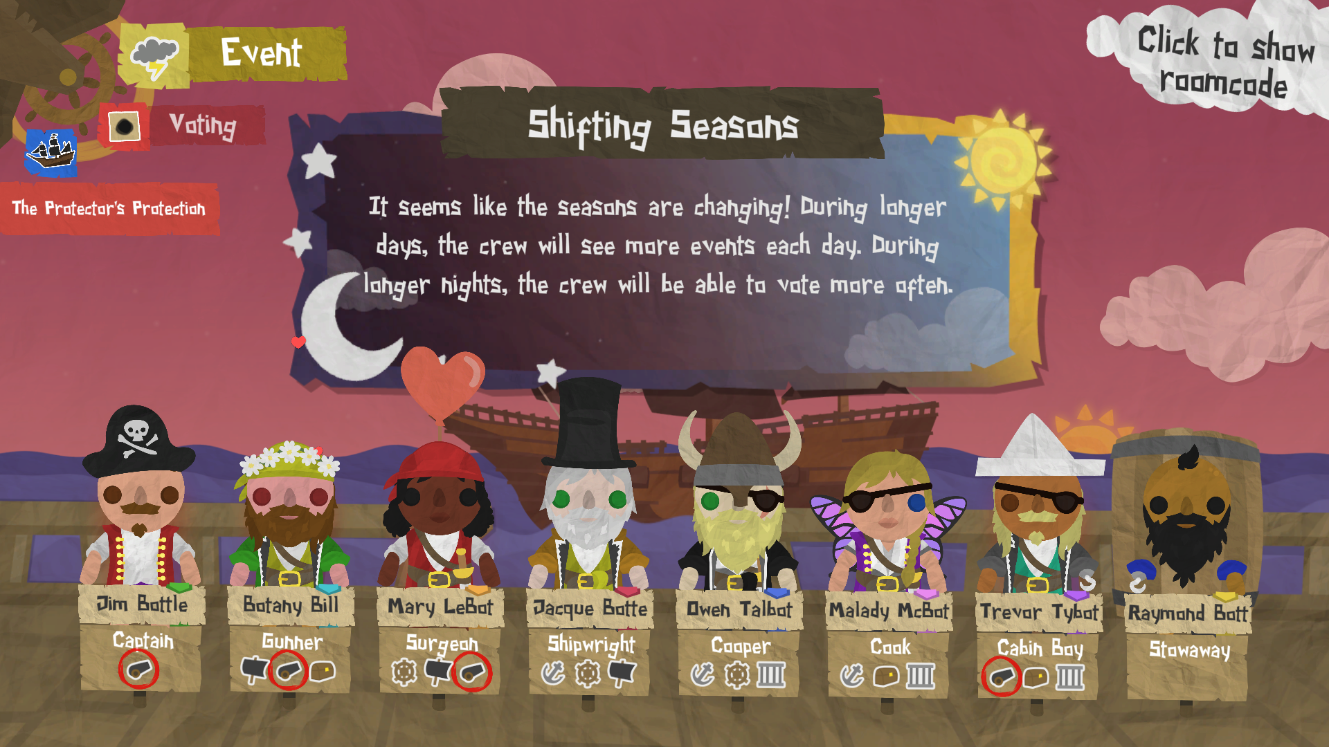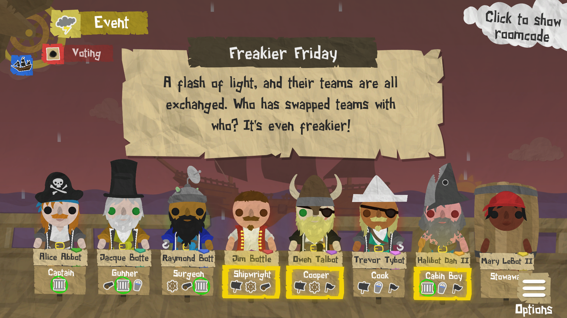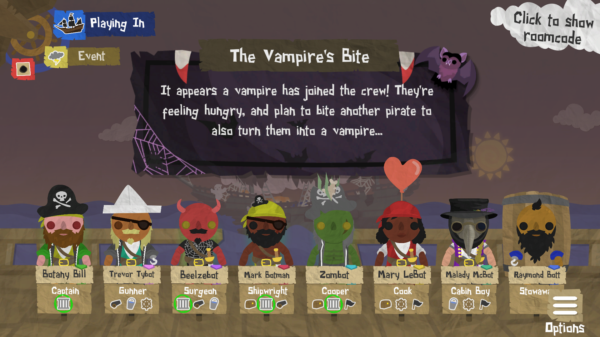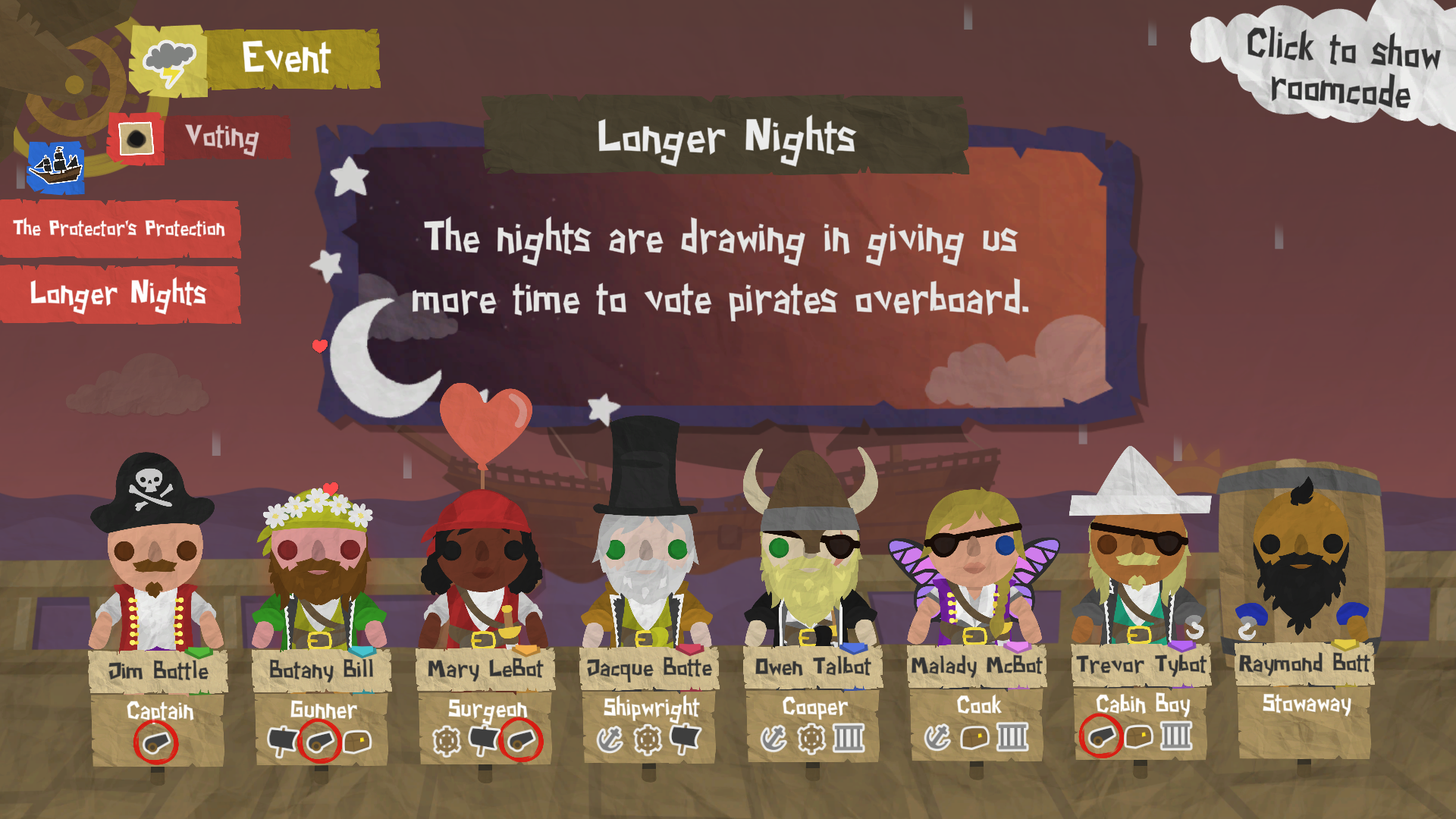 We've updated the Captain's Log and the game customisation screen to clearly list which traits are active and which are passive. If your voyage configuration doesn't have enough active or passive traits to go round the whole crew, some of the pirates might be declared Innocent (in place of a passive trait), or Inactive (in place of an active trait).