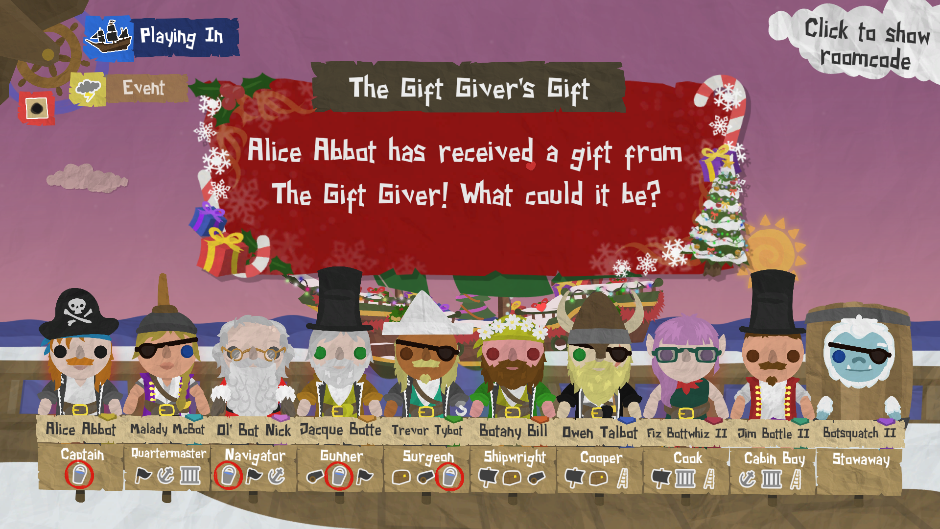 The special seasonal trait for Yule Tides is The Gift Giver! Play a trait game during Yule Tides and one of the pirates may find themselves playing as The Gift Giver.