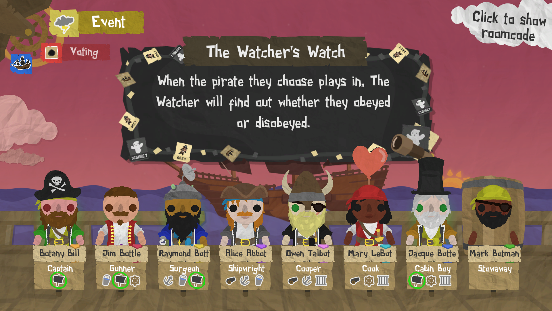 Proficient Prognosis: As The Psychic, correctly predict which pirate will next go overboard in a The Psychic's Prediction event