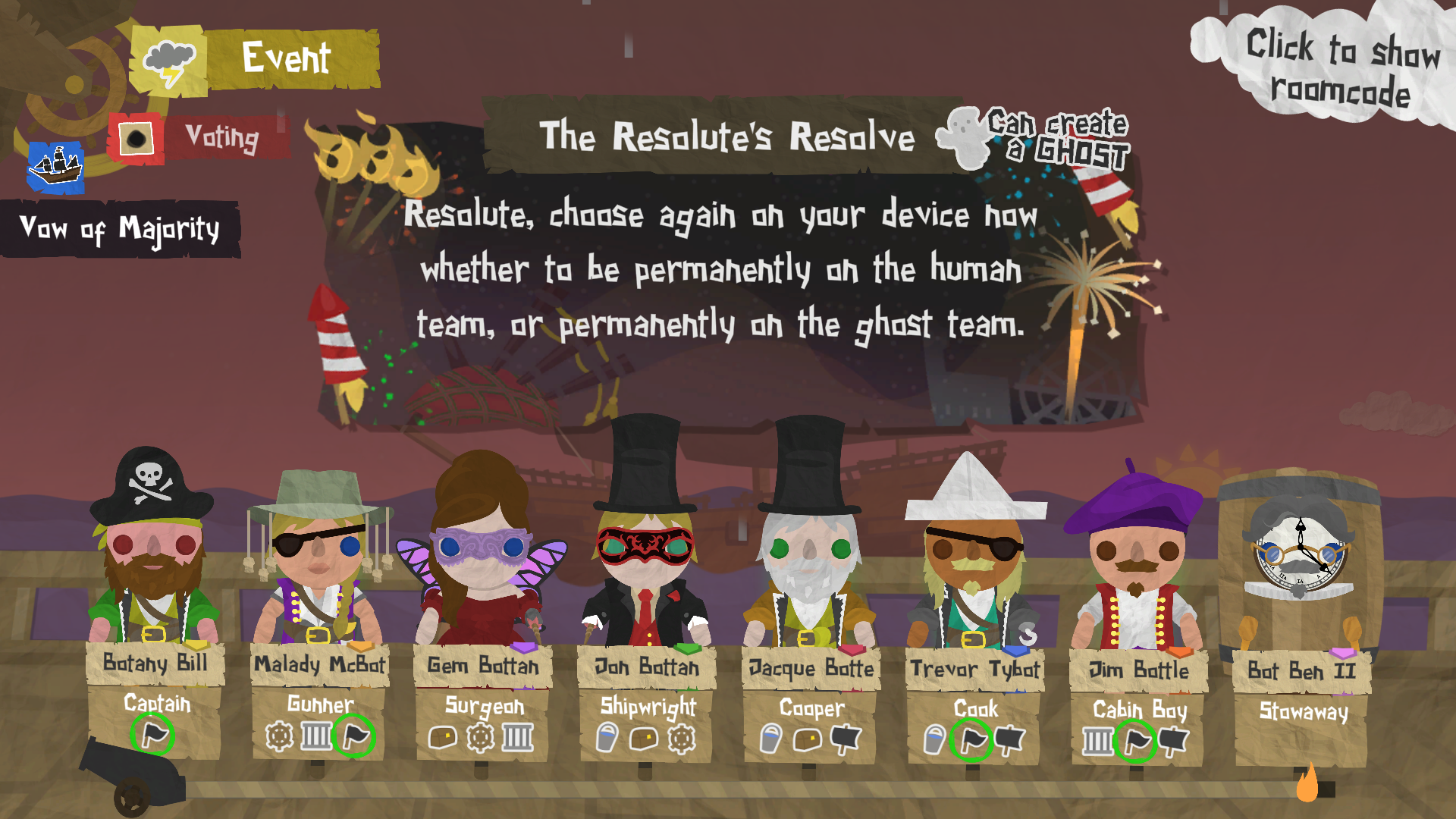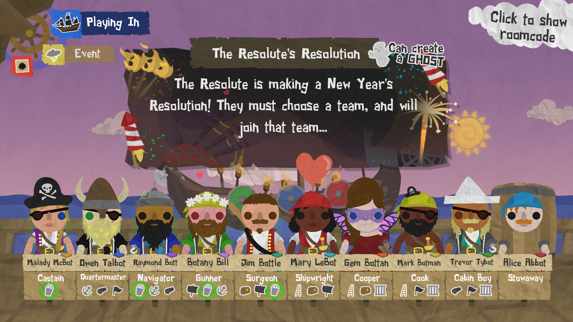 The Resolute must make a New Year's Resolution during the first day of the voyage. Their resolution asks them to pledge their allegiance to either the human or the ghost team. Whichever team they pick, they will instantly join - and they won't be able to become a member of the opposite team for the entirety of the remainder of the voyage!
