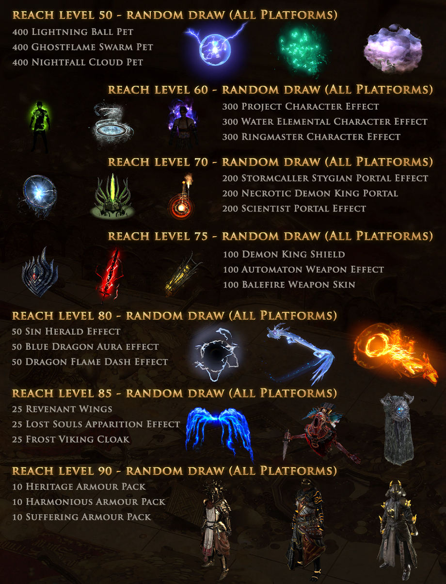 The event also has a pool of microtransaction prizes that are randomly drawn for characters that reach certain level thresholds. The pool of available prizes is shared between PC and Console players. Having multiple characters will increase your chances of winning a randomly drawn prize. More details on all the prizes can be found below.