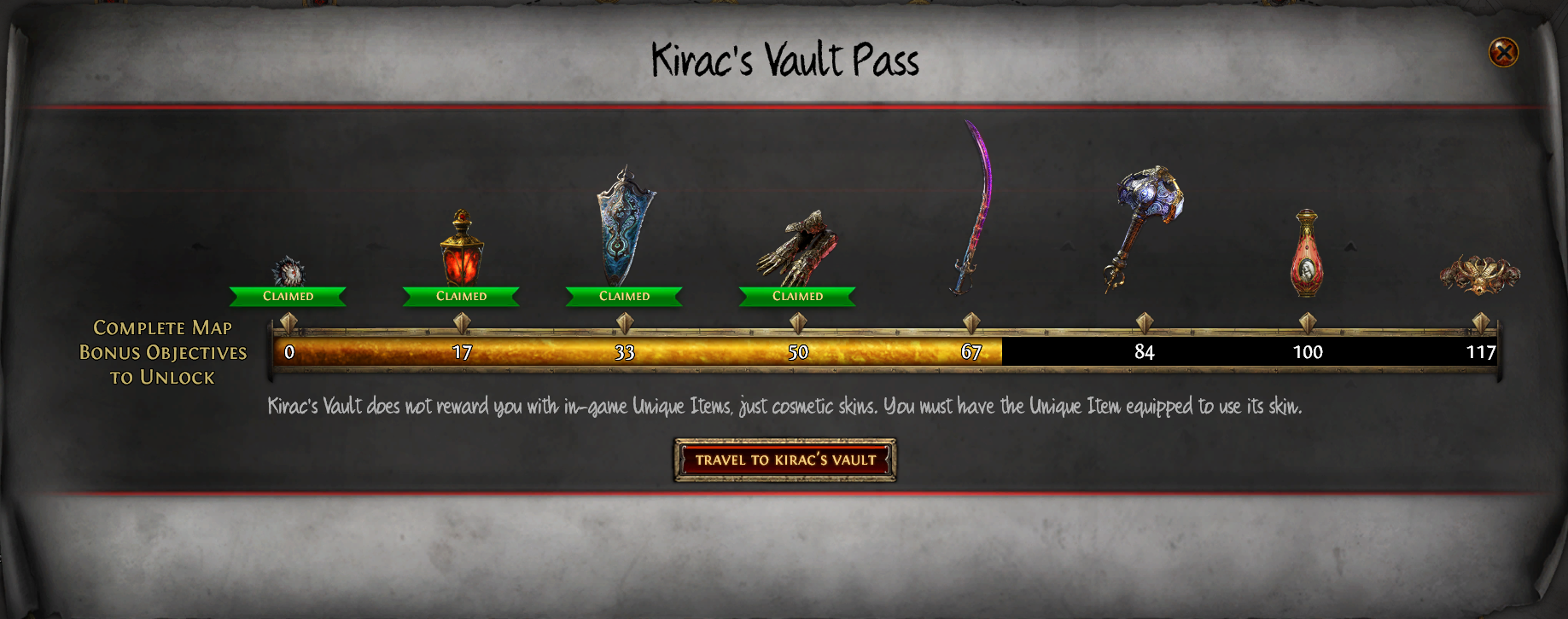 How do I claim my rewards? The Pass has a progress bar that tracks how many bonus objectives of maps on the atlas you have completed. Once you have unlocked a cosmetic unique item skin, you can click a button on the Pass screen to travel directly to Kirac's Vault, where a chamber containing that reward will unlock for you to claim.