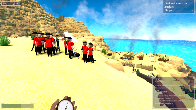 With that in mind, a lot of what we do needs to be balanced between making the game a satisfying RTS game, and making the game a satisfying FPS game. With combat in particular, this is not an easy line to draw. While the public version of the game still has only the very simply musketeers, the internal version of the game has had more complex AI for a while. Pirates and Soldiers weren’t directly aware of enemies that were close-by in the jungle, for example. There are noise and stealth variables, consideration of distance and obstacles between the units, and when a Pirate finally noticed a noise, he would go to investigate whether it was a soldier, villager, or if it must have been the wind - acting differently according to what he did or did not find.