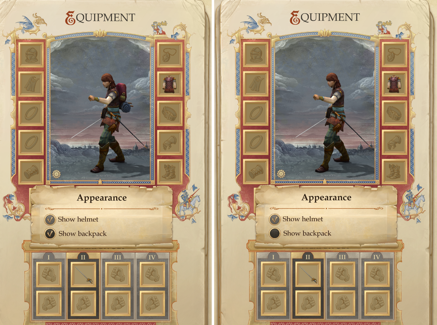 We know that not all of you liked the basic class outfits. Some don’t want their character to be carrying their backpack permanently, the others don’t like how the Inquisitor’s hat looks. There have already been mods made by independent authors that allow players to hide some parts of the outfit, but actually the task is more tricky than it seems. The truth is that the game initially didn’t include such an opportunity at the deep technical level.This means that implementing such a function could lead to some unexpected bugs and unpleasant breakage of the characters’ visual appearance, so we needed some time to make everything properly. Now this option will be available in the game officially, so that you may turn off some of the visual elements to make your character look the way you want him or her to look.