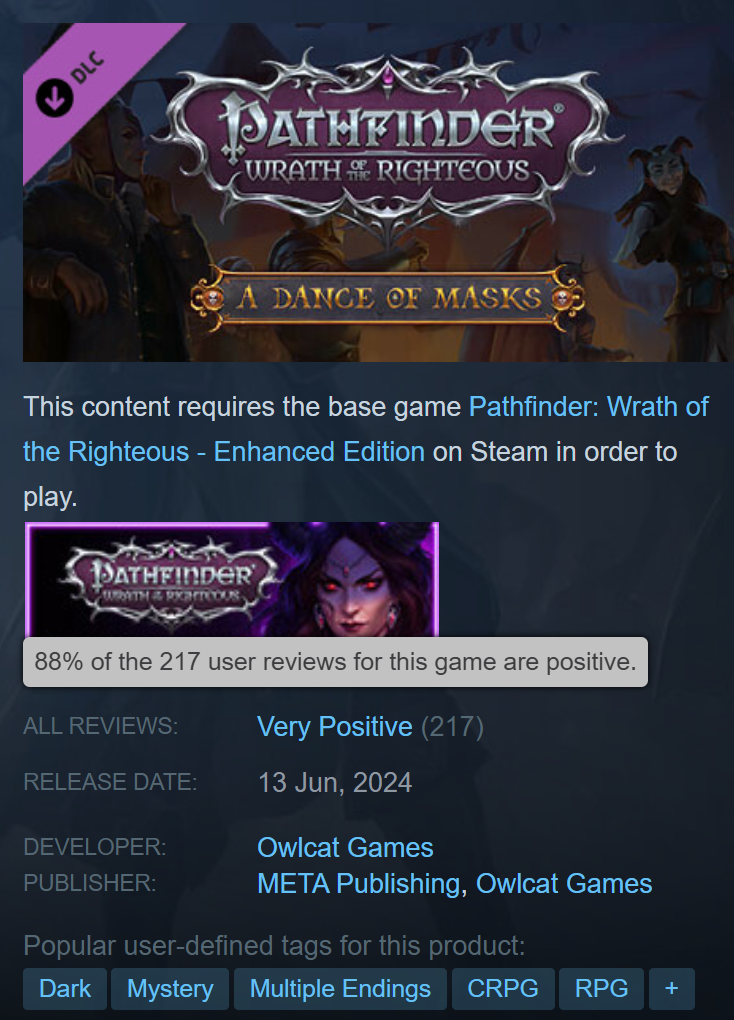 The Last Sarkorians became the first DLC for Wrath of the Righteous with very positive reviews on Steam, The Lord of Nothing was released to only slightly lower ratings, and A Dance of Masks is the best received DLC of all time for the game, sitting at 88% positive reviews at the time of writing!