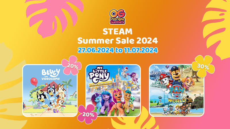 Outright Games Steam Summer Sale 2022! Today we announce the Steam Summer Sale, with lots of fantastic titles from Outright Games discounted, pick up some family favourites, including:My Friend Peppa Pig 40% OFF My Friend Peppa Pig: Pirate Adventures 30% OFF Paw Patrol Mighty Pups Save Adventure Bay 50% OFF Fast & Furious: Spy Racers Rise of SH1FT3R 40% OFF Jumanji: The Video Game 60% OFF Blaze and the Monster Machines: Axle City Racers 50% OFF Plus many more! You can find all of the discounts on our publisher page here . The Steam Summer Sale 2021 is Here! June 24, 2021