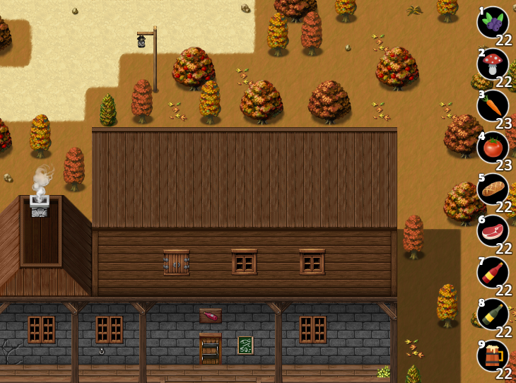 Keyboard shortcuts (1-9) added for eating food. With shortcuts from 1 to 9, you can consume Berry, Mushroom, Carrot, Tomato, Bread, Meat, Red Wine, White Wine, Tenemu Beer easily.